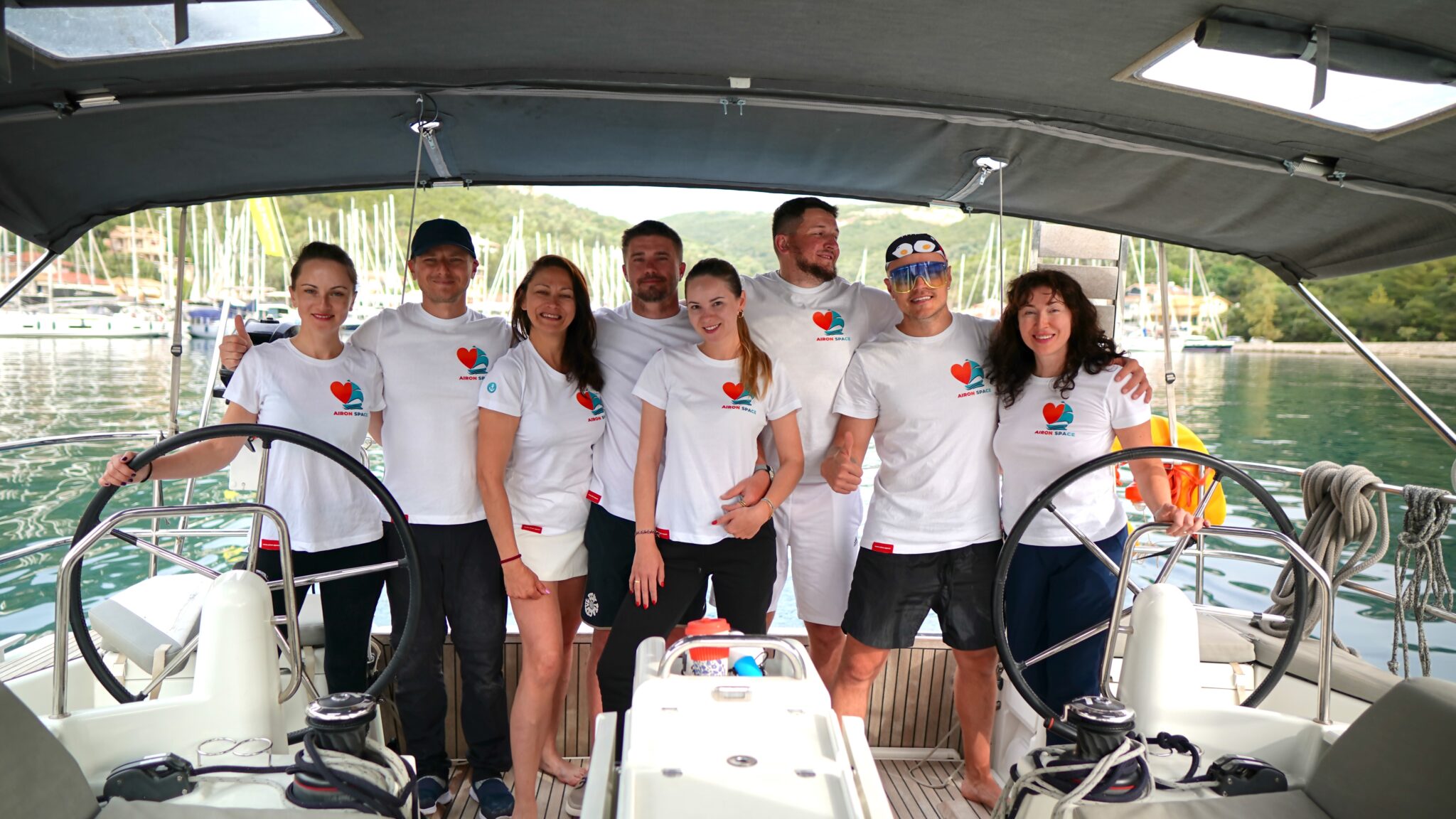 A private cabin with a bathroom. The yacht also features common relaxation areas: a salon, an upper deck, and a cockpit.